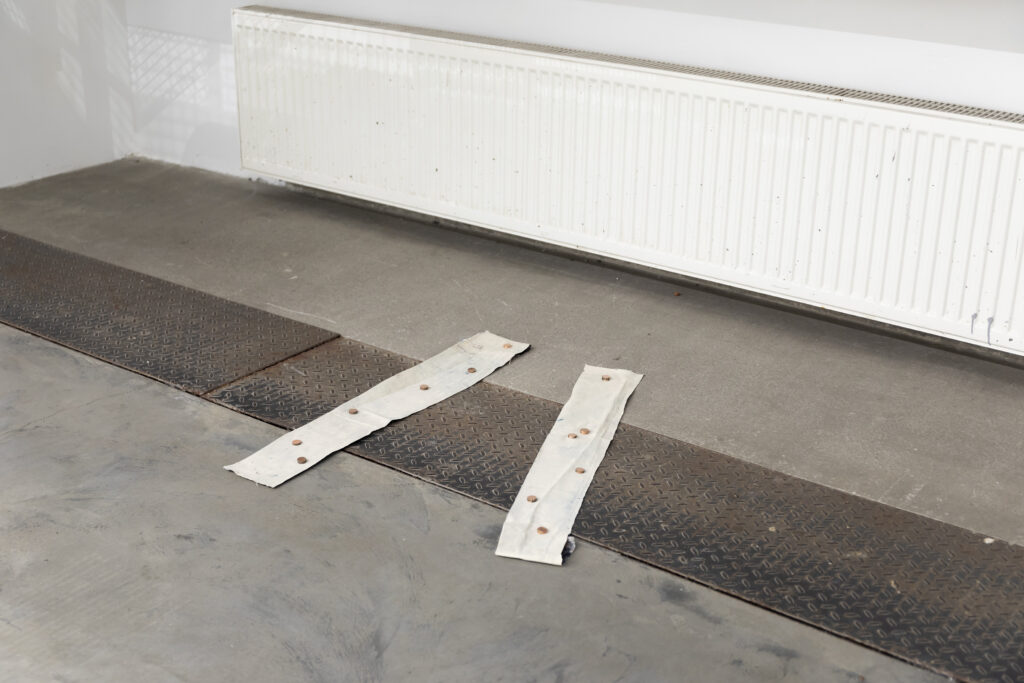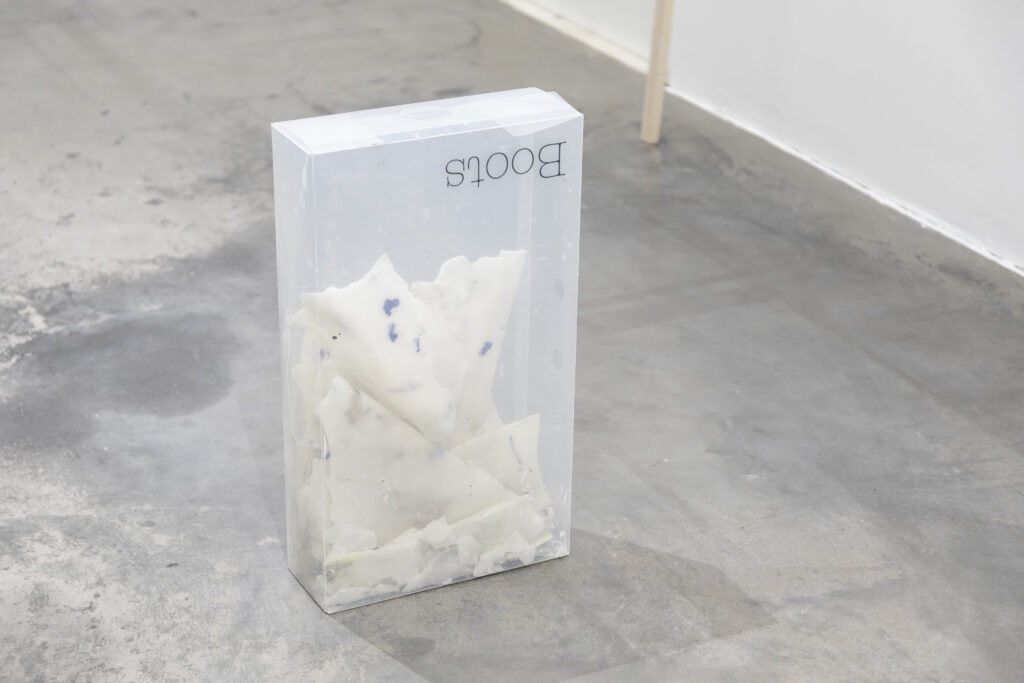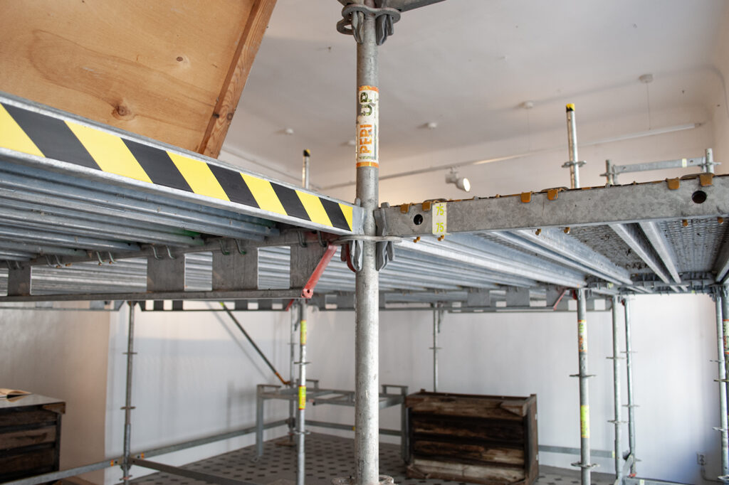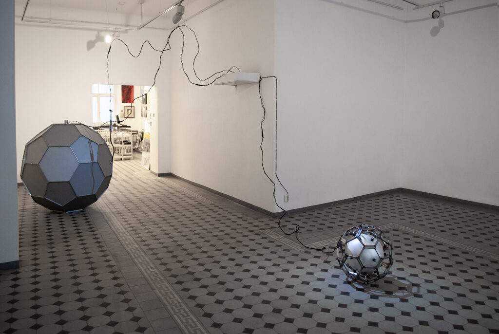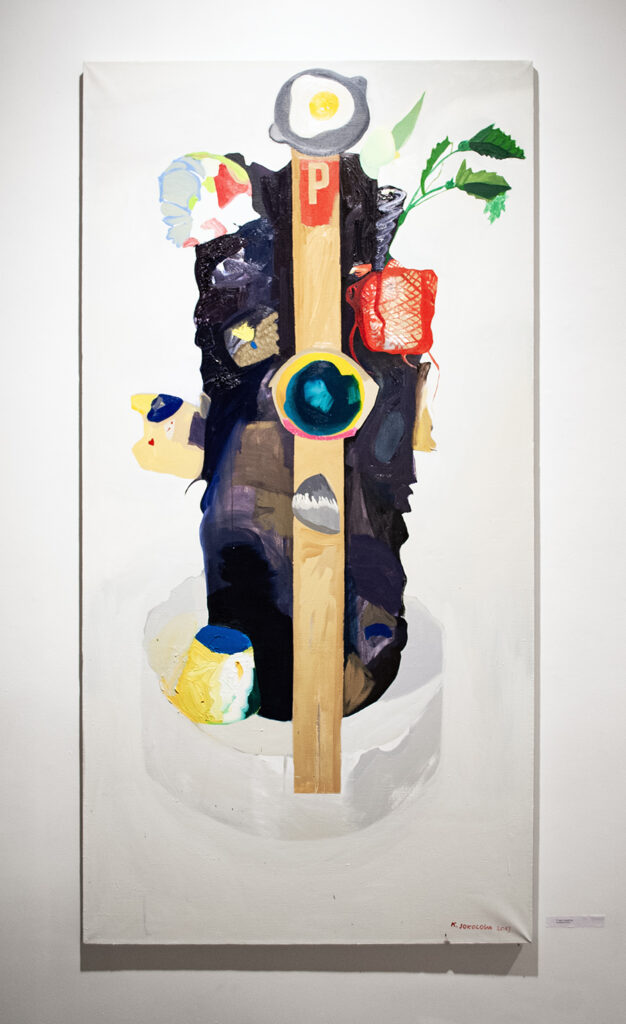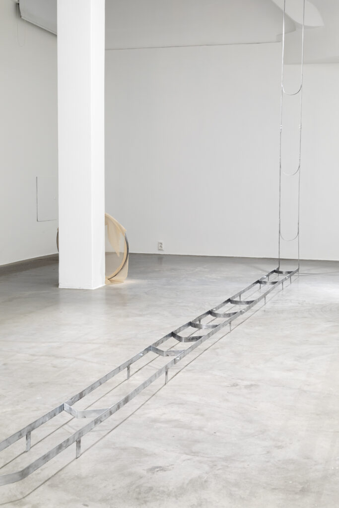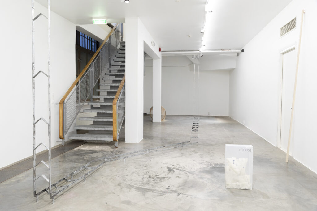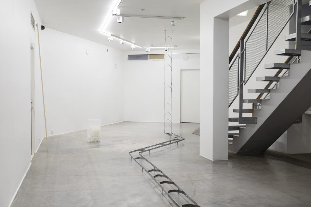 For the exhibition, Petra works with a large hand-bent metal structure inspired by play settings, from board and arcade games to outdoor play. She explores movement, trajectories, loops, and schematic representations of play, allowing these elements to shape the work’s rhythm and material presence in the space. By using everyday materials and objects, Tuomas builds sculptural systems and collages. In addition to conversing with the site and Petra’s practice, notions of consumption, joy and restlessness were considered while making.